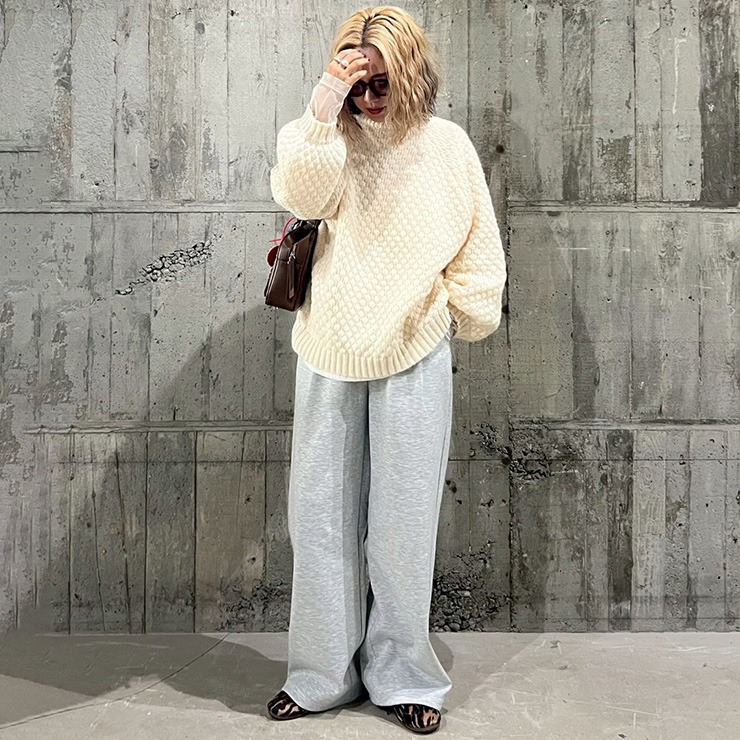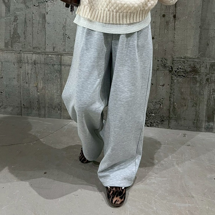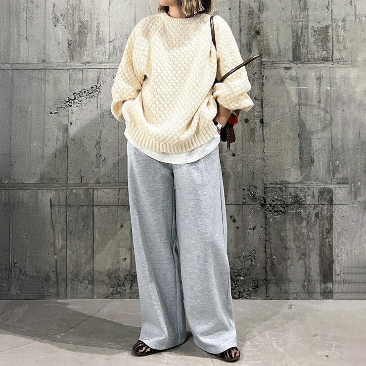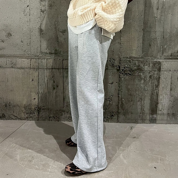 やわらかな肌触りのよいダンボールニット素材の裏起毛加工を施したワイドパンツです。ウエストゴム仕様で着脱がラクです。内紐ありでサイズ感の微調整が可能です。裾にドロスト付でシルエットが2パターン楽しめるのもポイントです!