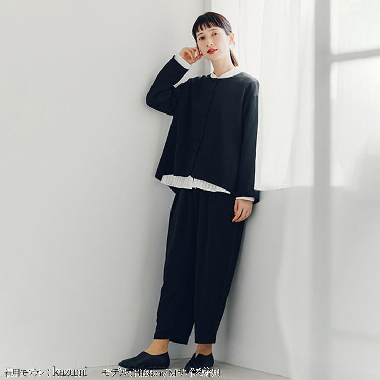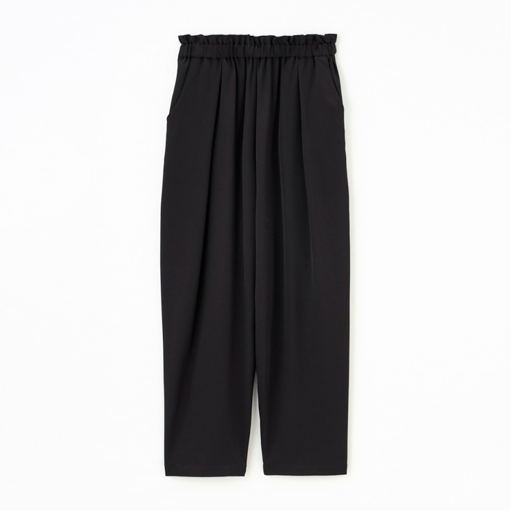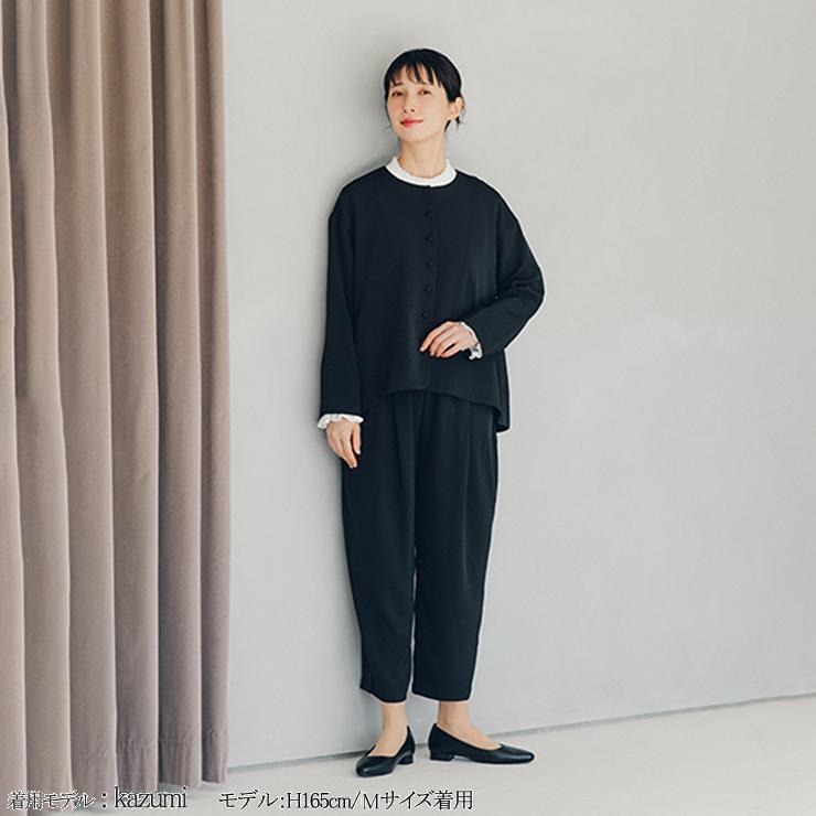 上品でフォーマルな印象のとろみを持たせた素材で仕立てたテーパードパンツです。