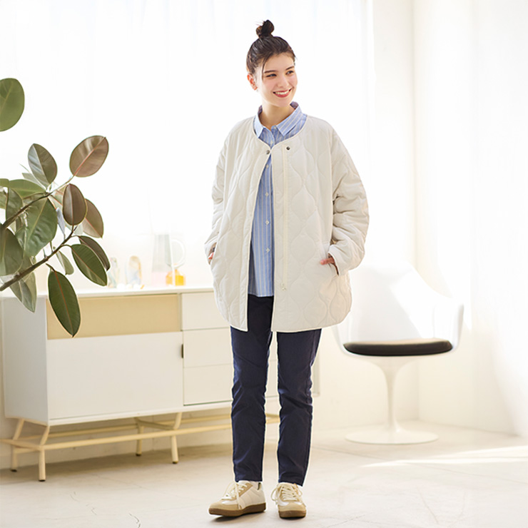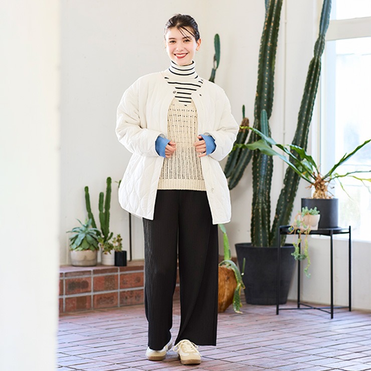 新春らしく明るいコーディネートになるホワイト系のアウターとニットベスト、爽やかなサックスのシャツ、着回ししやすいボトム2点の6点セット。