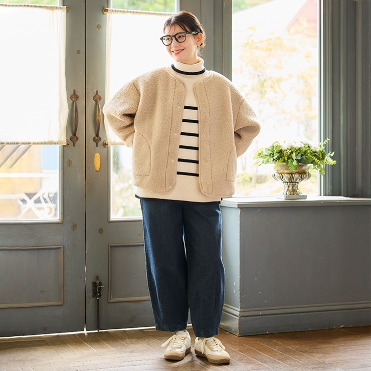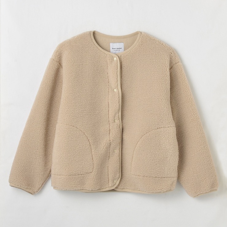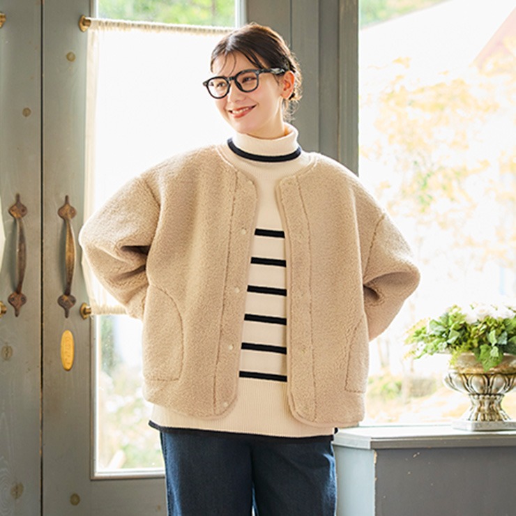 季節感たっぷりなボアフリースのノーカラージャケット。