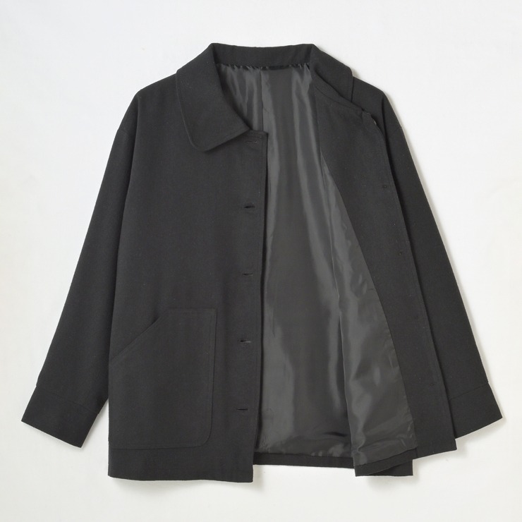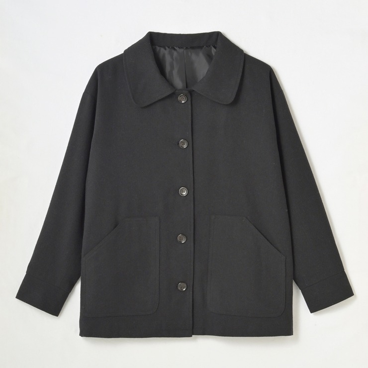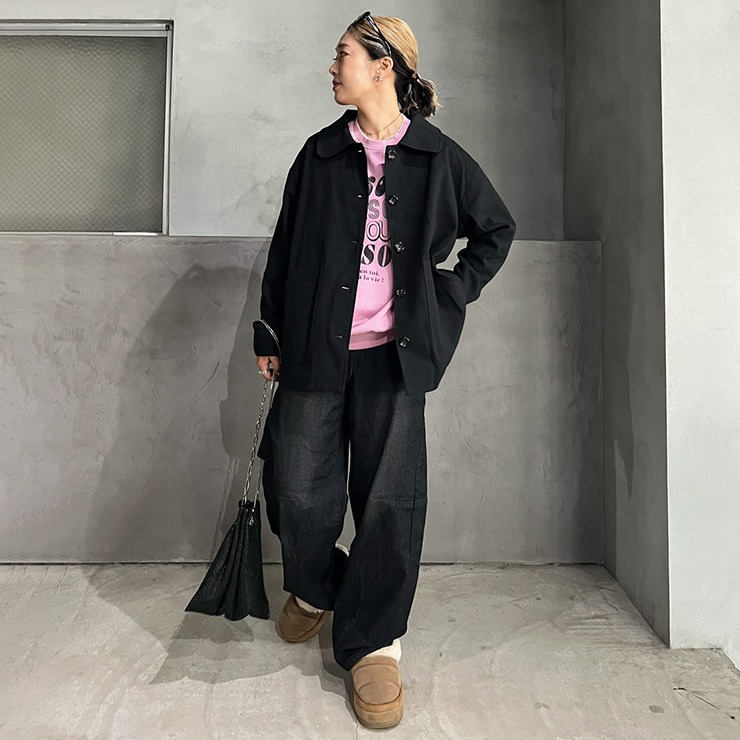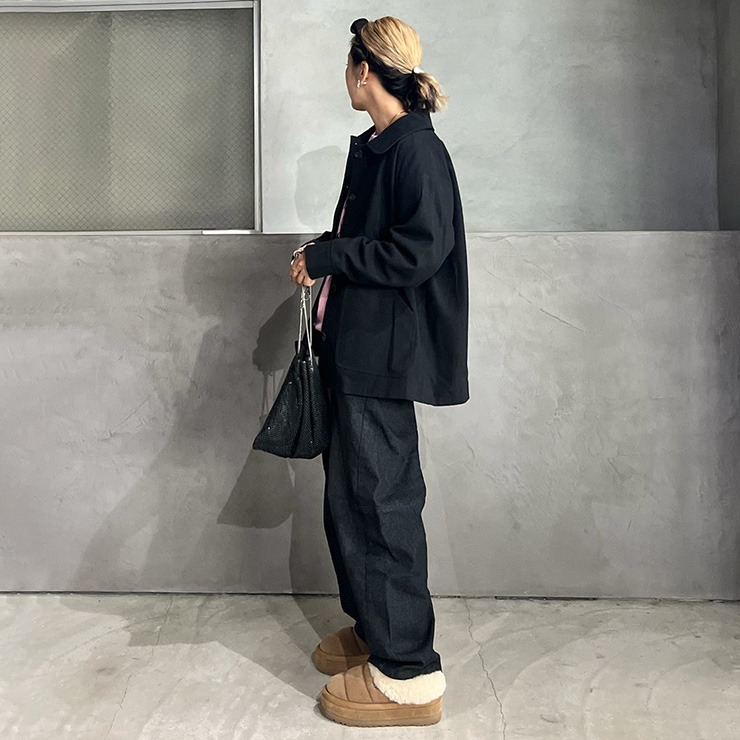 ラウンドの襟がポイントのコートです。ゆったりシルエットで抜け感を演出します。フェイクウールなので、がんがん着られて重すぎない着心地なのが魅力です。
