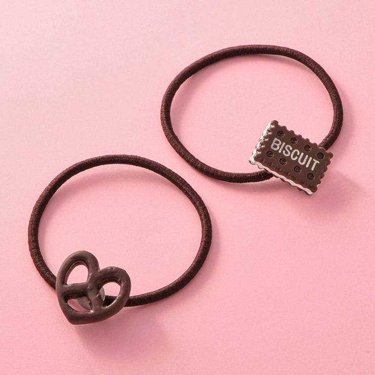 チョコプレッツェルとビスケットがヘアスタイルのアクセントになる、遊び心のあるオシャレなヘアゴムです♪