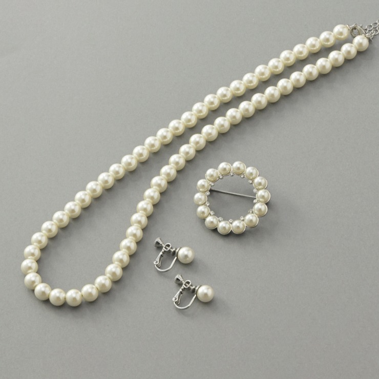 イヤリング、ネックレス、ブローチのフォーマルアクセサリー3点セット。コーディネートの華やかなワンポイントにおすすめです。様々なシーンに活躍するセットアイテムです。
