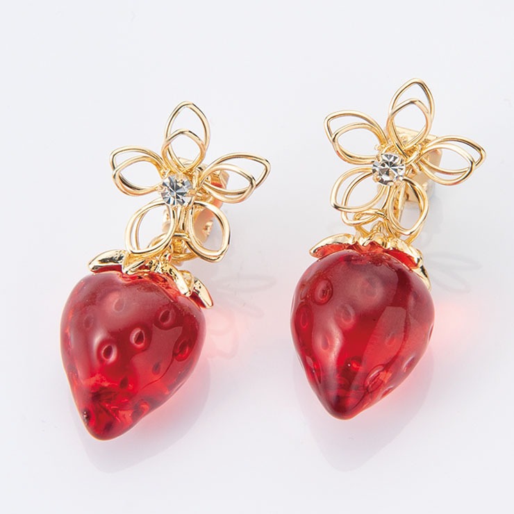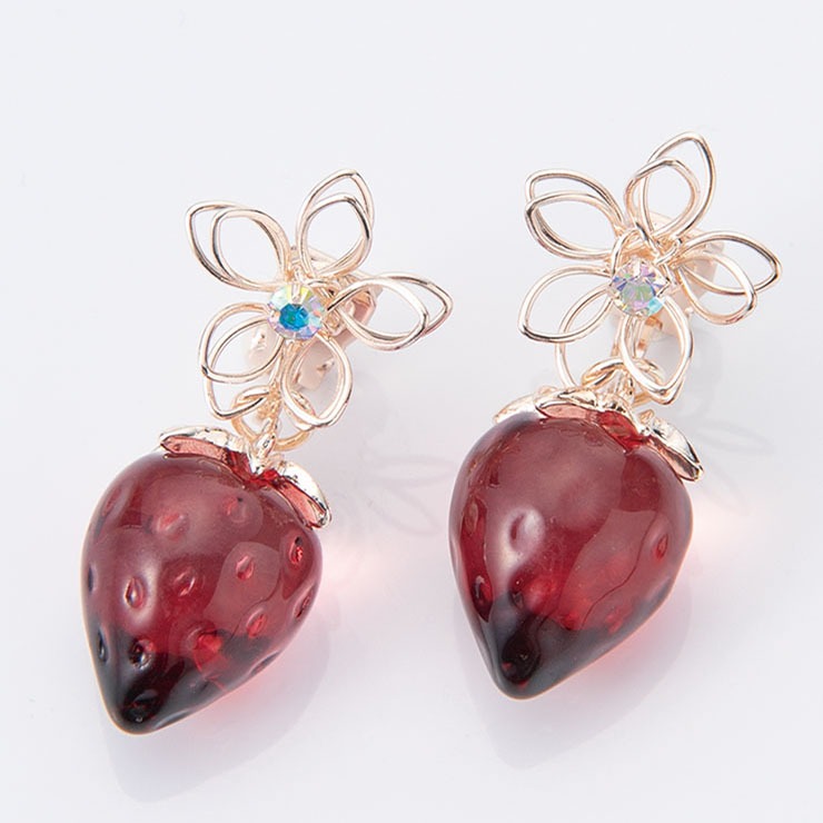 繊細なワイヤー細工のフラワーとぷっくりしたクリアカラーの苺との組み合わせが目を引きます!耳元で苺がゆらゆら揺れて、お顔周りをぱっと華やかに彩ってくれます♪