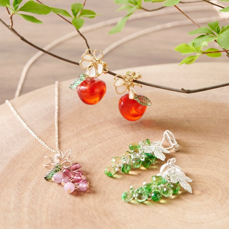 胸元で揺れる葡萄の実がコーディネートをぱっと華やかにしてくれます!グラデーションカラーの葡萄が動くたびに違う表情を見せてくれます♪
