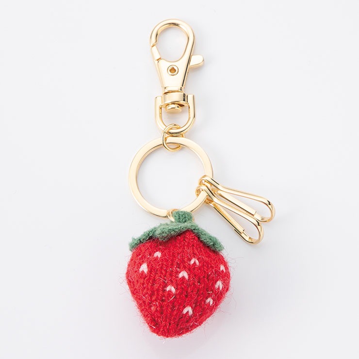 ぷっくり編み込んだニットの苺がほっこりしたデザインです♪キーホルダーやバッグチャームとしてお使いいただけます。