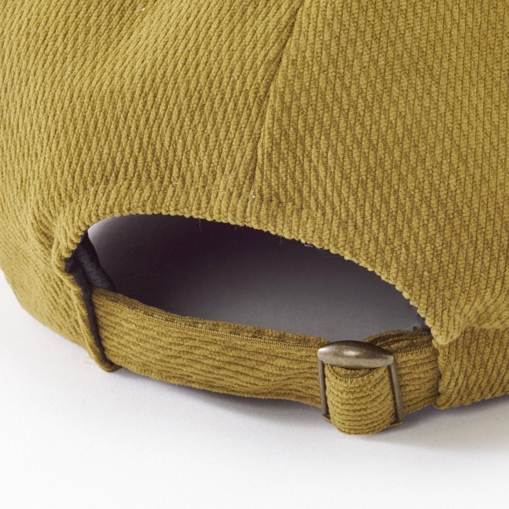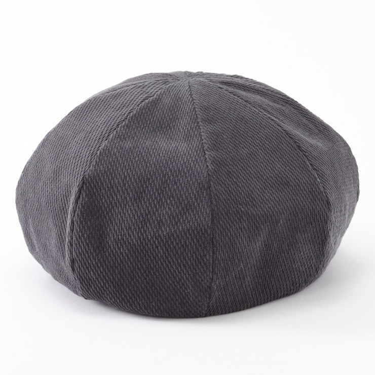 コーデュロイ感のある生地のベレー帽子。あたまの剥ぎが8分割になっており、より丸みをもったシルエットになっています。後ろ側はサイズ調整ベルトになっています。