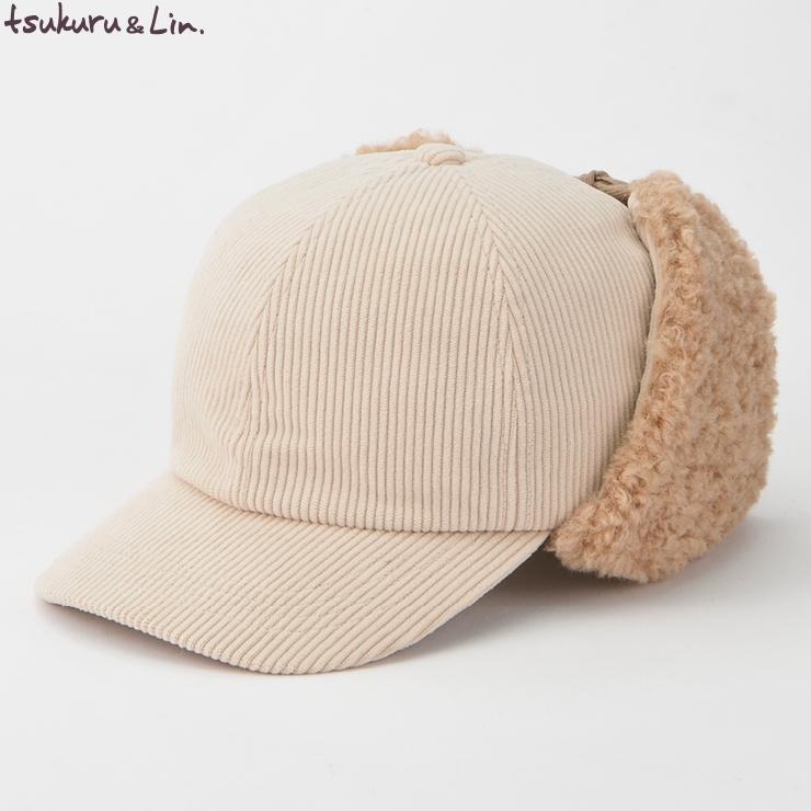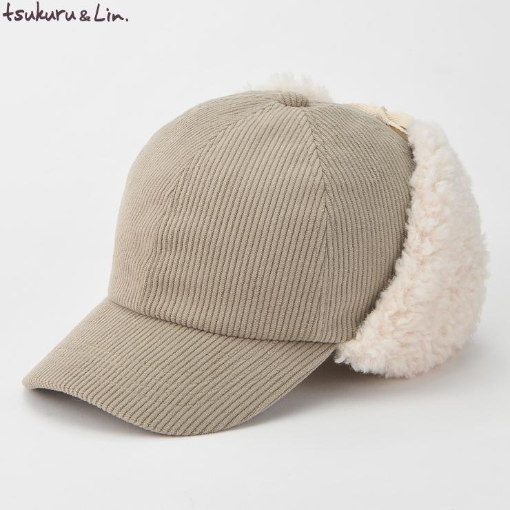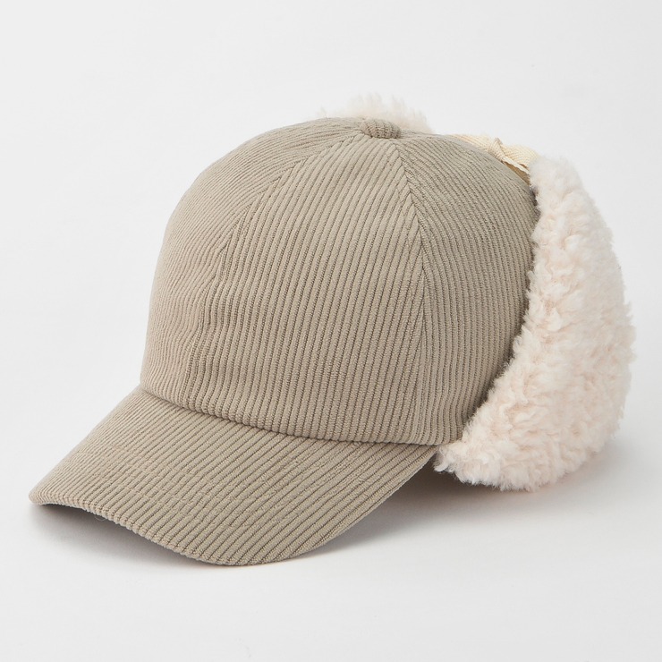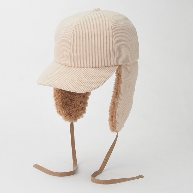 コーデュロイ生地にボアの耳あてを組み合わせたパイロットキャップ。あたまの上の結び紐や裏側の配色もアクセントになっています。