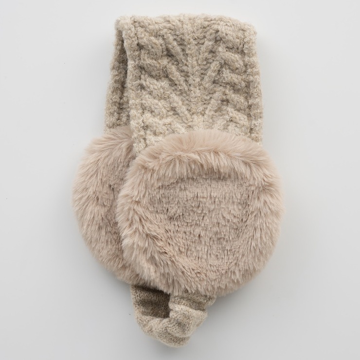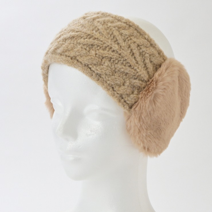 耳あて部分がフェイクファーになったニットとコンビのヘアバンド。エアリーな糸とファー生地のほっこり感がマッチしてます。