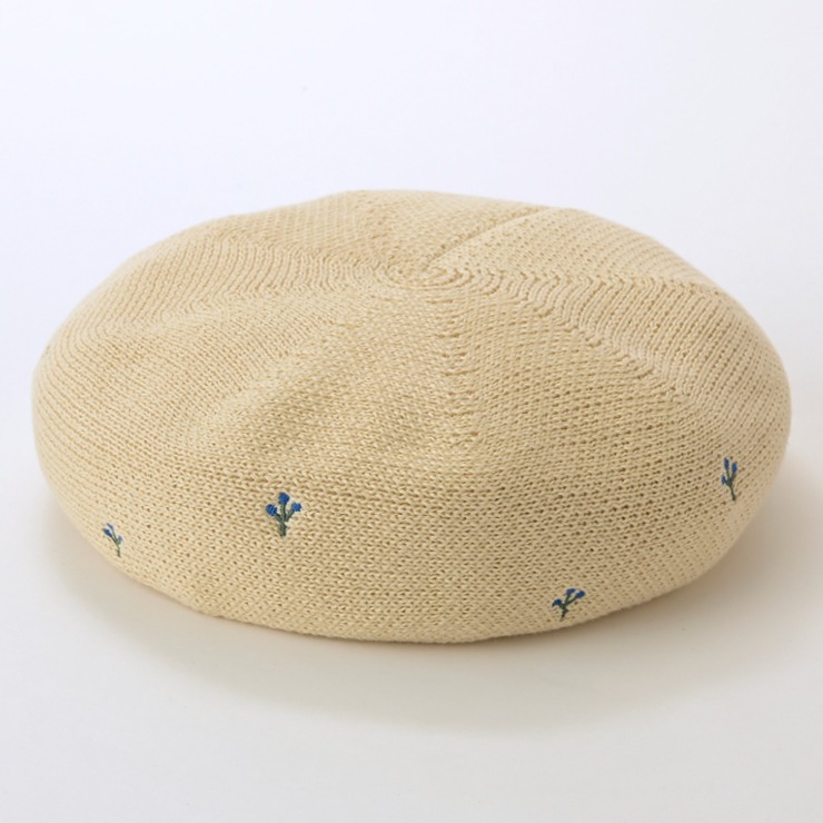 ネモフィラ風の刺繍を施したニットベレー。やわらかいタッチでかぶりやすいです。