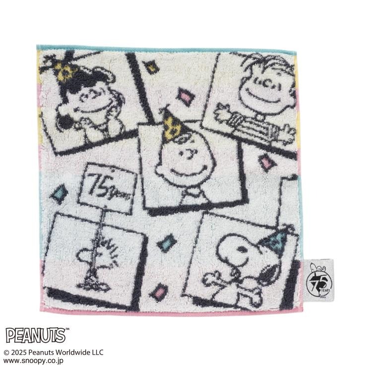 日本製(今治)でやわらかな手触りのミニタオルです。PEANUTSコミック誕生75周年の記念アートデザインがポイントです。