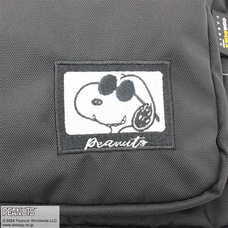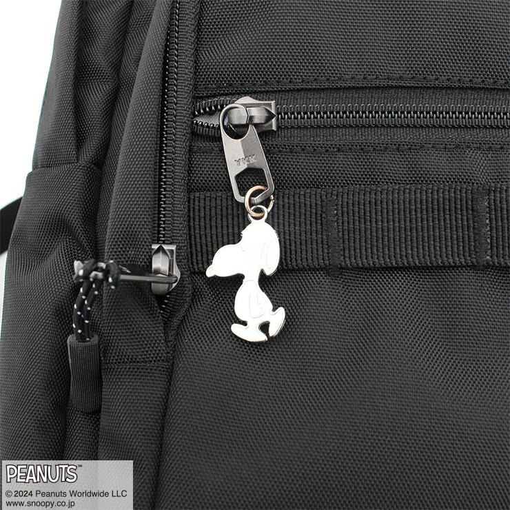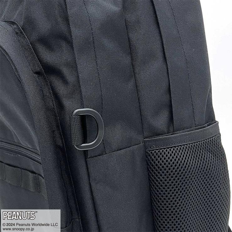 PEANUTSの文字が刺繍された可愛いリュックサック。本体生地は摩擦に強いコーデュラファブリックを採用。正面にはキーホルダー等を引っ掛けることのできるキーホックも付いています。正面ポケットのファスナー持ち手がスヌーピーの形をしているのも可愛い。内装はメイン収納が2ルームに分かれており、荷物を仕分けして収納可能です。約30リットルの大容量で収納力抜群。ノートPCやタブレットを入れるのに便利なクッションポケットも付いています。本体側面には500mLペットボトルを入れられるメッシュポケット付き。背面部分はメッシュ&クッションで背負い心地も快適です。スーツケースのキャリーバーに通せる使用になっているので、旅行時にも便利です。