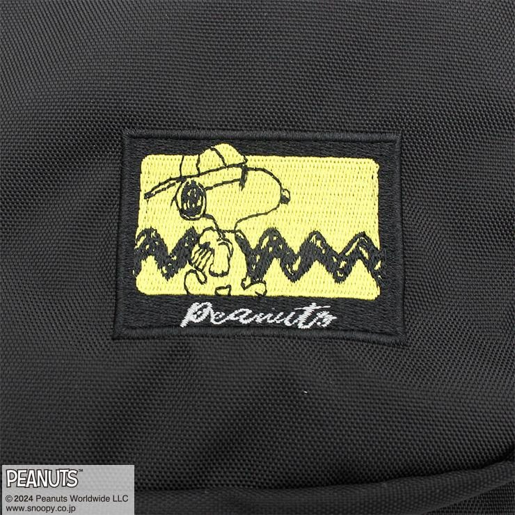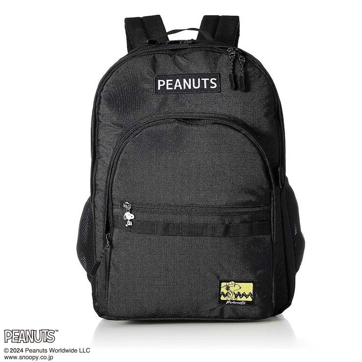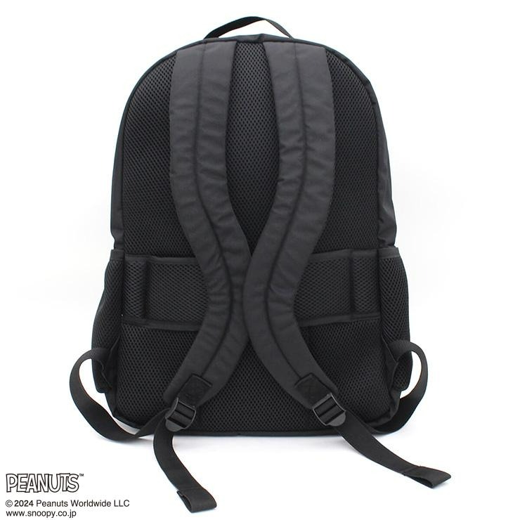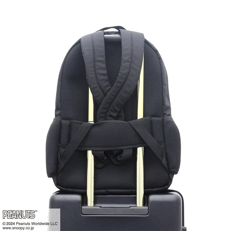 PEANUTSの文字が刺繍された可愛いリュックサック。本体生地は摩擦に強いコーデュラファブリックを採用。正面にはキーホルダー等を引っ掛けることのできるキーホックも付いています。正面ポケットのファスナー持ち手がスヌーピーの形をしているのも可愛い。内装はメイン収納が2ルームに分かれており、荷物を仕分けして収納可能です。約30リットルの大容量で収納力抜群。ノートPCやタブレットを入れるのに便利なクッションポケットも付いています。本体側面には500mLペットボトルを入れられるメッシュポケット付き。背面部分はメッシュ&クッションで背負い心地も快適です。スーツケースのキャリーバーに通せる使用になっているので、旅行時にも便利です。