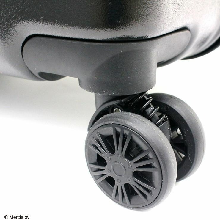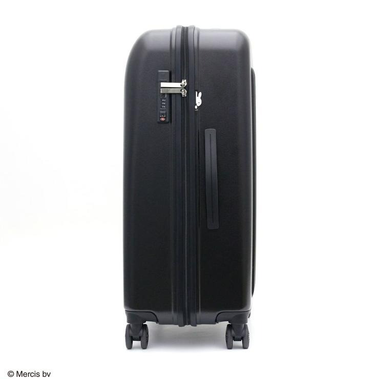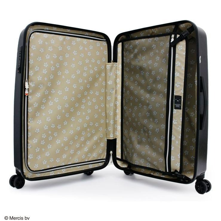 キャスターはダブルキャスターにサスペンション付きで、走行性が格段に上がりました。錠前はダイヤルロックとシリンダーロックの両方が使用可能なシフレロックを搭載。錠前横のひょっこり覗くミッフィーも可愛いアクセントになっています。内装は荷崩れを抑える仕切りが両面に付いています。ファスナー持ち手もミッフィーになっています。