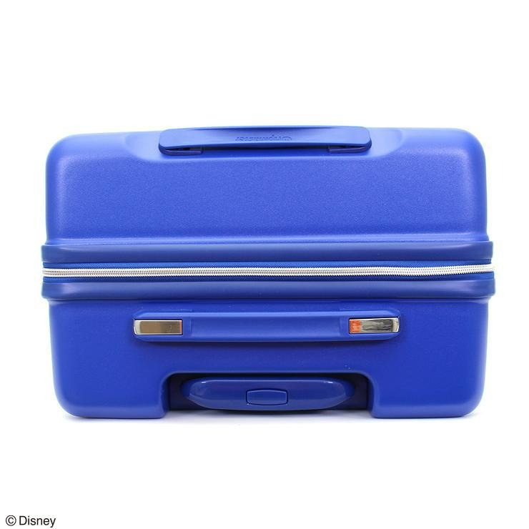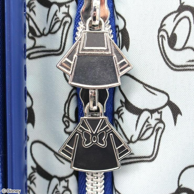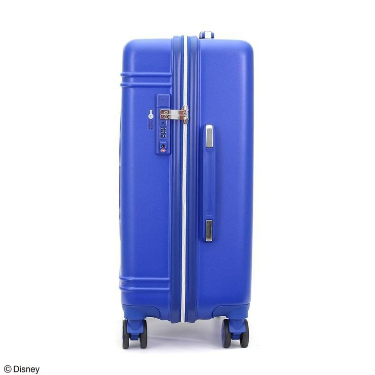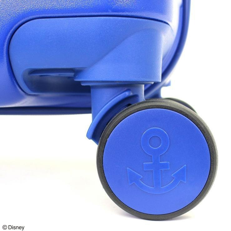 ドナルドダックが本体正面に大胆に描かれたキャリーケースです。ファスナー持ち手を錠前に装着すると錨のマークになるこだわり。本体正面上部にもう一つハンドルが付いており、荷物を載せたまま持ち上げることができる便利な機能付き。また、正面下部にも持ち手が付いているので車のトランクなどに収納する時に役立ちます。キャスターはダブルキャスターで走行性抜群。またホイルキャップも錨デザインになっています。内装はドナルドダックの様々な表情が楽しい総柄デザインで、ファスナー持ち手はドナルドダックの洋服になっているのもこだわりの一つです。