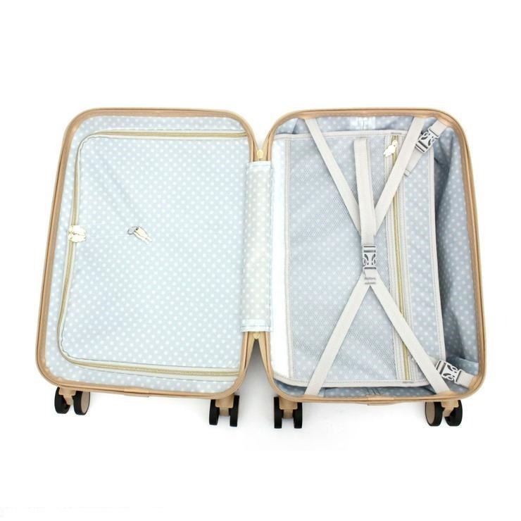 リラックマのお顔が大きくデザインされたスーツケース。背面にはリラックマのファスナーがプリントされています。本体のメインファスナーにはリラックマとキイロイトリが表現されています。キャスターはダブルキャスター、走行性が格段にアップするサスペンション搭載。ホイルキャップのキイロイトリもこだわりの一つ。鍵はダイヤルロックとシリンダーロックの2種類をお使いいただけます。内装はリラックマと同じ水色の水玉デザイン。ファスナーはリラックマの後ろ姿がデザインされています。内装片面は完全密封型で、開けた際に荷物がこぼれるのを抑えます。