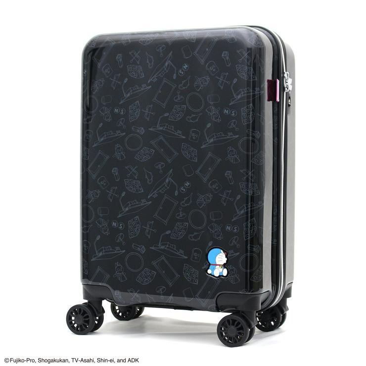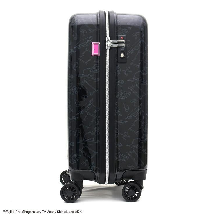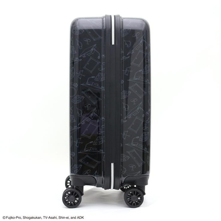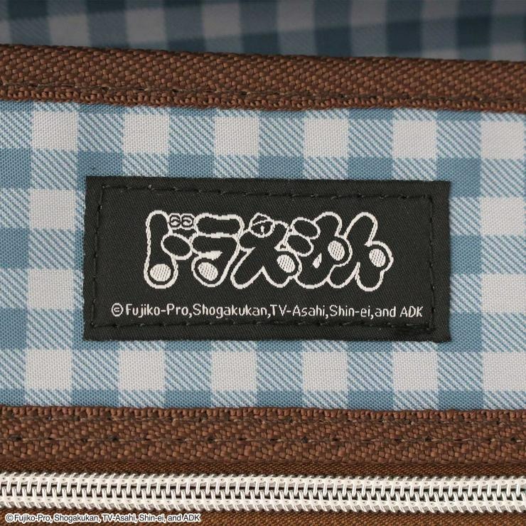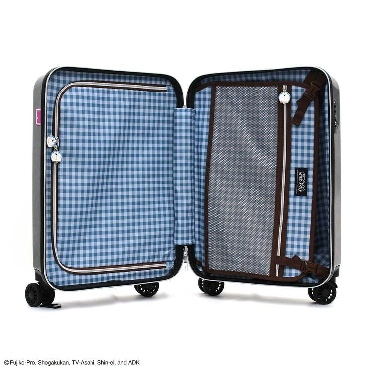 色々なひみつ道具のアートが本体全体にデザインされたドラえもんのスーツケース。正面右下のお座りしたドラえもんのプレートがポイントです。また、鍵付近のどこでもドアもこだわりの一つ。キャスターは走行性高いダブルキャスターを搭載。内装は片面が完全密封型で開けた際に荷物がこぼれるのを防ぎます。ファスナーがドラえもんのお顔になっているのも可愛い。内装生地はブルーのギンガムチェック柄で、ドラえもんをイメージさせる色合いになっています。