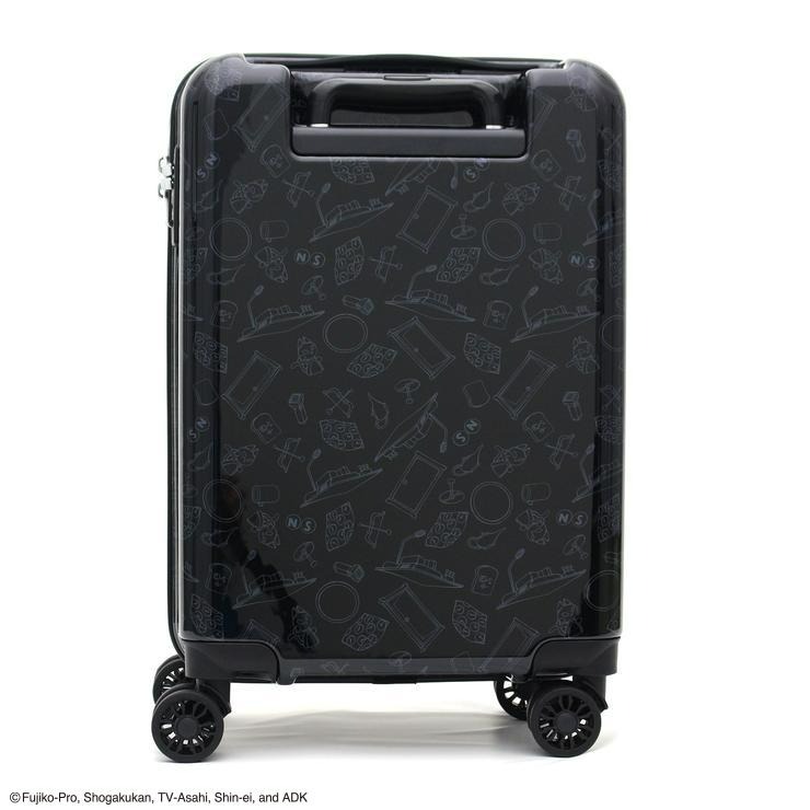 色々なひみつ道具のアートが本体全体にデザインされたドラえもんのスーツケース。正面右下のお座りしたドラえもんのプレートがポイントです。また、鍵付近のどこでもドアもこだわりの一つ。キャスターは走行性高いダブルキャスターを搭載。内装は片面が完全密封型で開けた際に荷物がこぼれるのを防ぎます。ファスナーがドラえもんのお顔になっているのも可愛い。内装生地はブルーのギンガムチェック柄で、ドラえもんをイメージさせる色合いになっています。