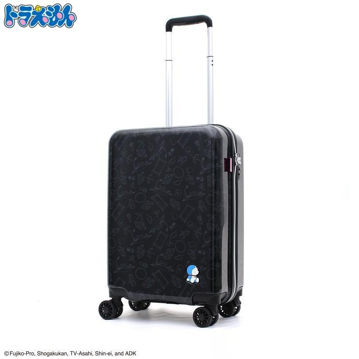 色々なひみつ道具のアートが本体全体にデザインされたドラえもんのスーツケース。正面右下のお座りしたドラえもんのプレートがポイントです。また、鍵付近のどこでもドアもこだわりの一つ。キャスターは走行性高いダブルキャスターを搭載。内装は片面が完全密封型で開けた際に荷物がこぼれるのを防ぎます。ファスナーがドラえもんのお顔になっているのも可愛い。内装生地はブルーのギンガムチェック柄で、ドラえもんをイメージさせる色合いになっています。