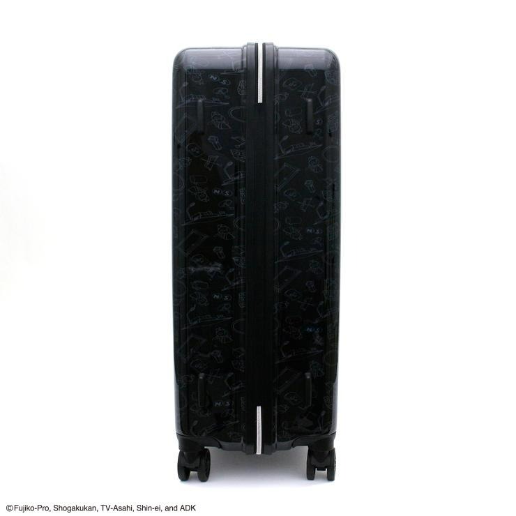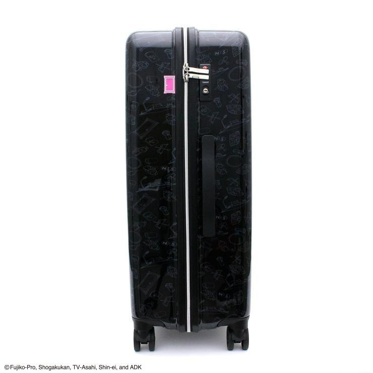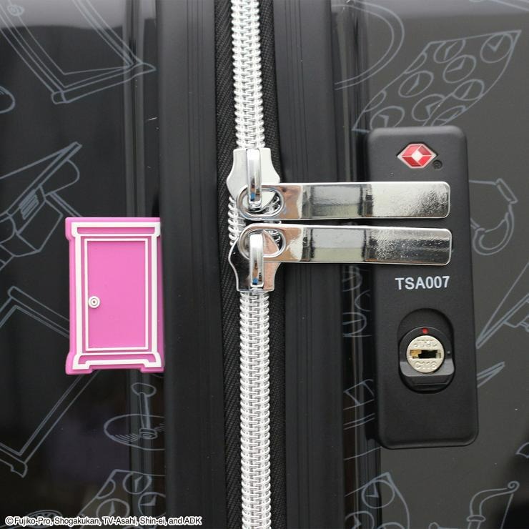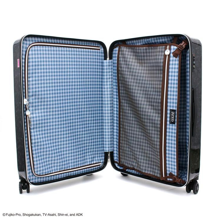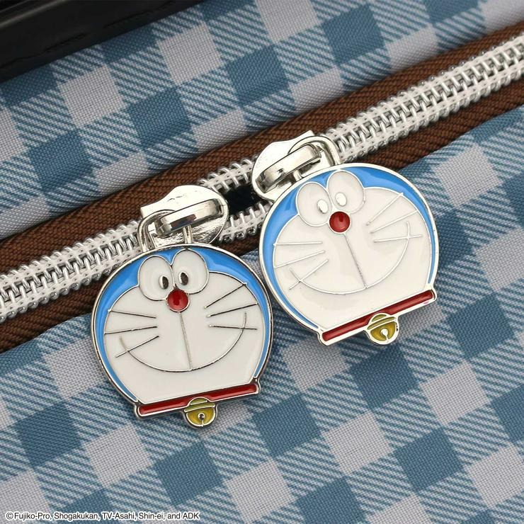 色々なひみつ道具のアートが本体全体にデザインされたドラえもんのスーツケース。正面右下のお座りしたドラえもんのプレートがポイントです。また、鍵付近のどこでもドアもこだわりの一つ。キャスターは走行性高いダブルキャスターを搭載。内装は片面が完全密封型で開けた際に荷物がこぼれるのを防ぎます。ファスナーがドラえもんのお顔になっているのも可愛い。内装生地はブルーのギンガムチェック柄で、ドラえもんをイメージさせる色合いになっています。