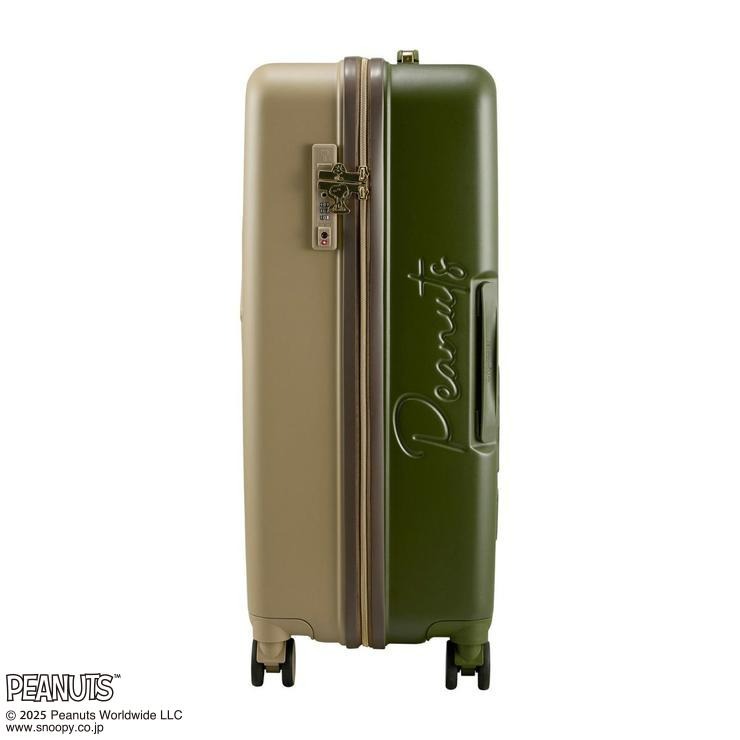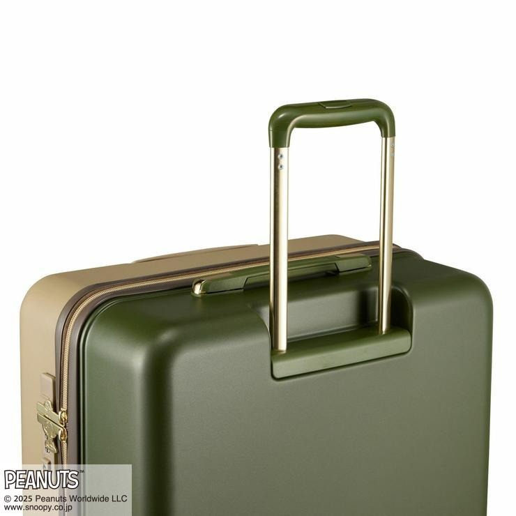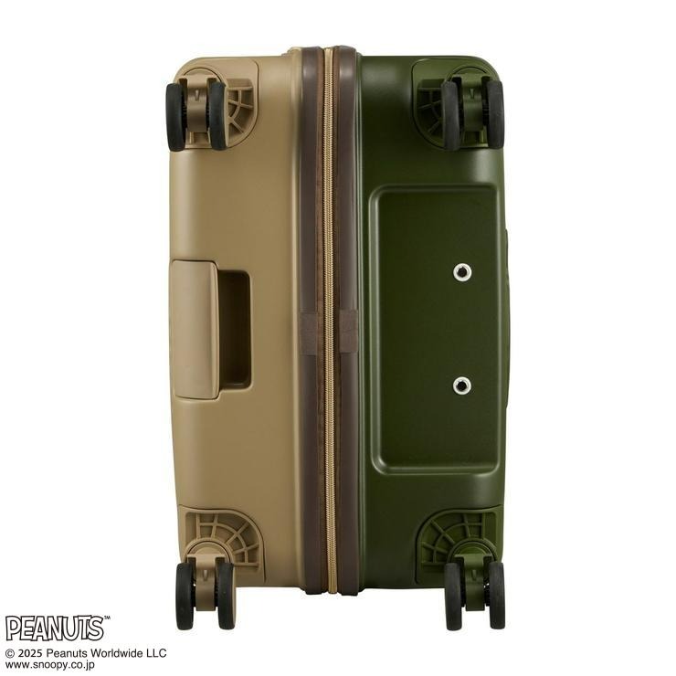 外側のファスナートップにはスヌーピーとウッドストックがデザインされています。前面と背面で色が異なるツートンカラー。キャスターも同色でまとめています。