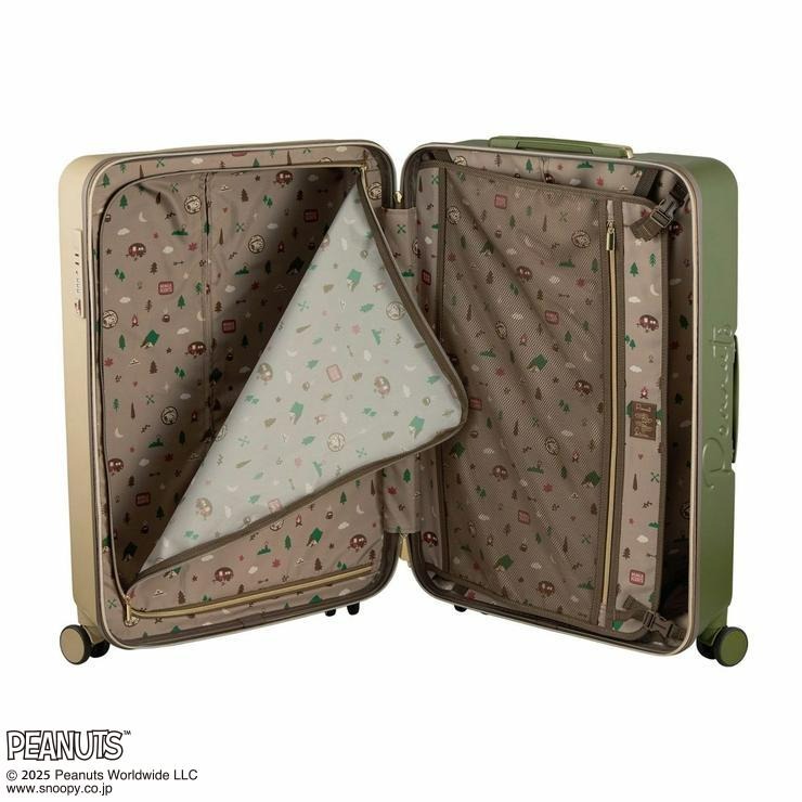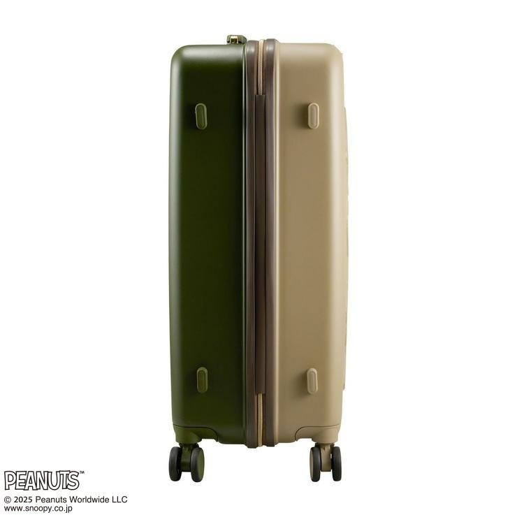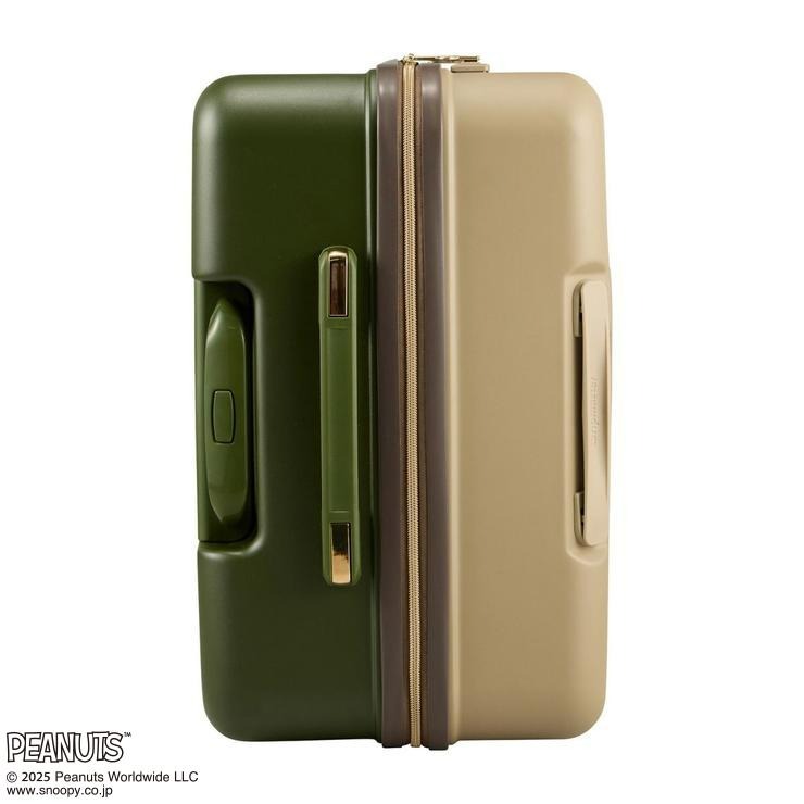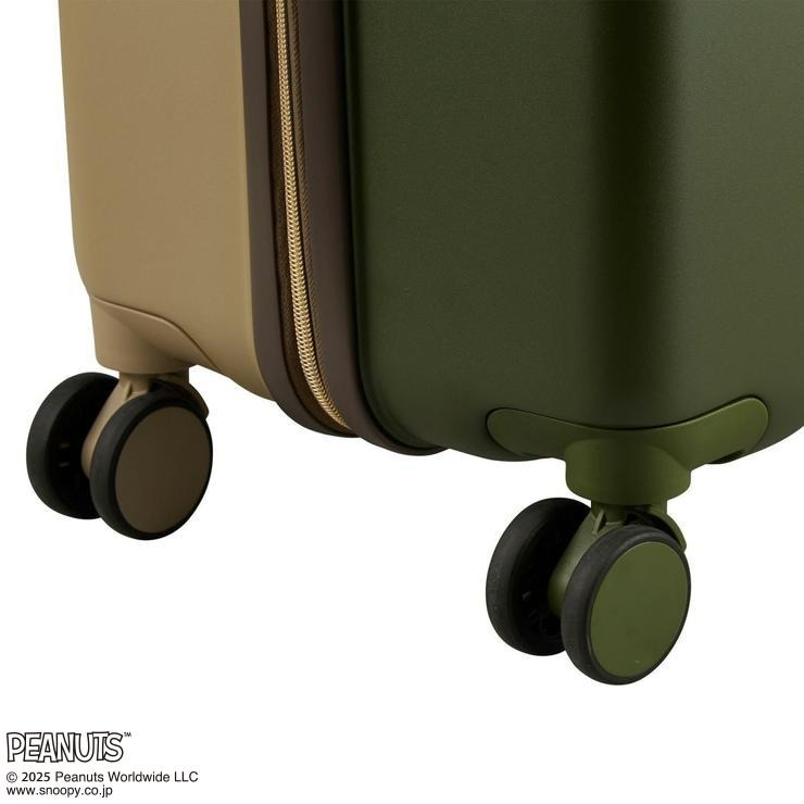 外側のファスナートップにはスヌーピーとウッドストックがデザインされています。前面と背面で色が異なるツートンカラー。キャスターも同色でまとめています。