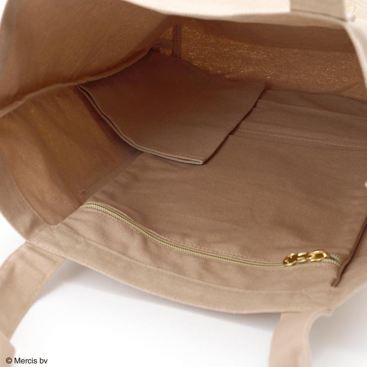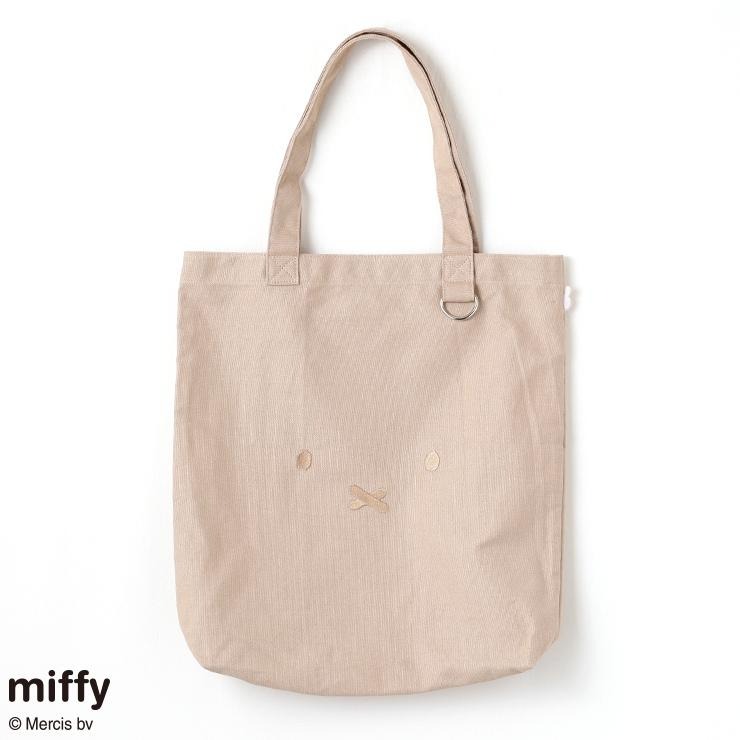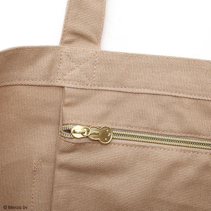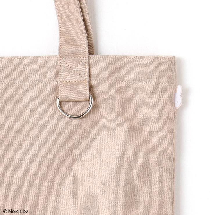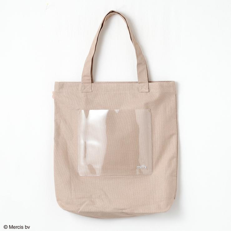 7色展開が嬉しいたっぷり容量のミッフィー帆布トート。目口のお顔部分が刺繍仕上げになっています。A4ファイルがゆったり入るサイズです。正面にはDカンが付いており、キーホルダーなどが付けられます。背面には透明ポケットが付いているので、中に入れたものが外側から見えて便利です。内装には水筒や500mLペットボトルが立てて入るホルダーがあり、収納しやすい機能付き。またファスナー付きポケットには小物類などが収納可能です。本体横にひょっこり覗くミッフィーも特徴です。