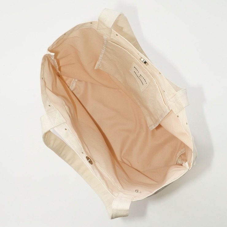 開口部はマグネット釦で留めることができ、内装には小物類などが入るファスナー付きポケットがあります。
