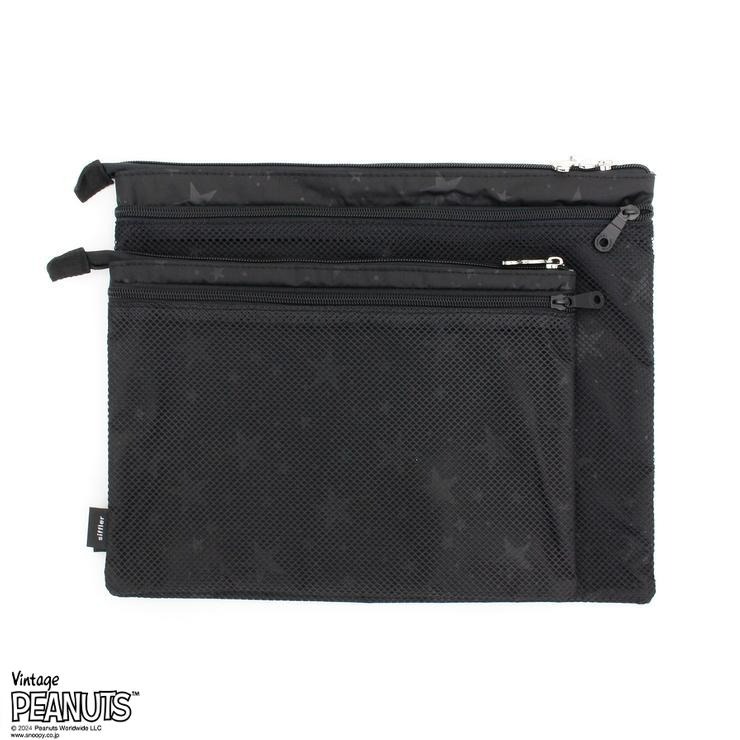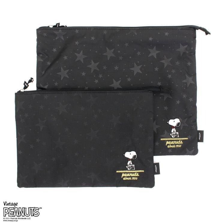 スヌーピーと星柄がさりげなく表現されている2サイズポーチセット。旅行に行く際、バッグやスーツケースの中を仕分けながら収納する際にとっても便利です。前面にはメッシュポケットが付いており、開けずに何を入れたかわかるのも嬉しい。