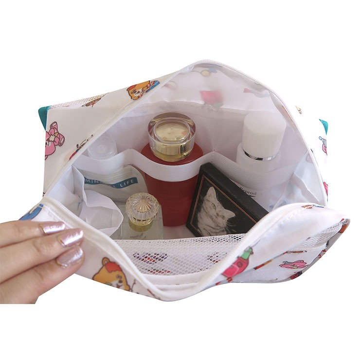 ●メインのポケットは内側のゴムベルトでボトル等を固定できます。その他、透明ポケット、メッシュポケット小分けポケット、背面ポケット、計5箇所のポケットでたっぷり収納でき、収納物を整理しやすい仕様になっています。