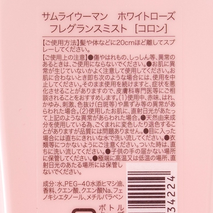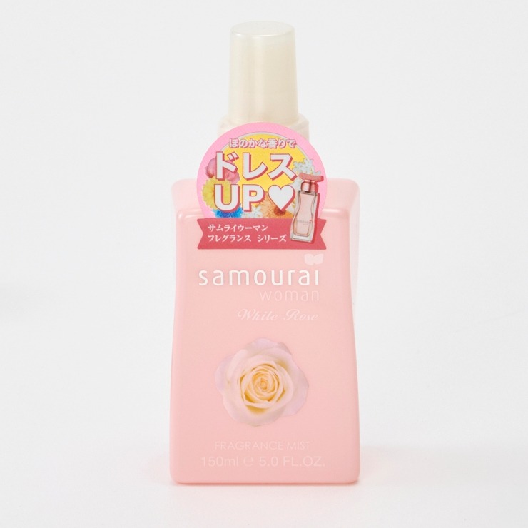 サムライウーマンシリーズの大ヒット香水「サムライウーマン ホワイトローズ」の香りがミストタイプで新登場。強すぎず、ふんわり香るので、車内や狭い空間でも周りを気にせず気分UP!デート前の待ち合わせ、学校やオフィス、スポーツ後に。いつでもどこでも気軽に香りをチャージ。お出かけ前の身だしなみ、髪にも使えます。やさしいローズの香りが幾重にも重なる、「サムライウーマンホワイトローズ」の香り。