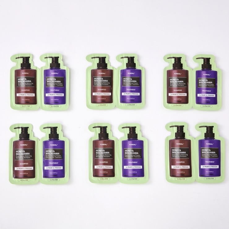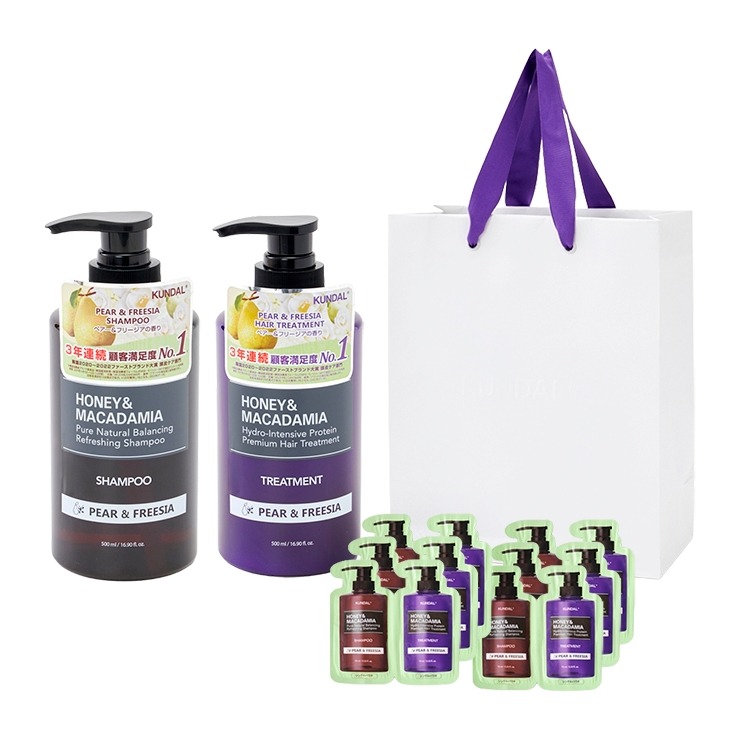 人気のハニー&マカデミアシリーズから、ムスクやベルガモットを基調としたペアー&フリージアの香りのシャンプー本品、トリートメント本品、1回分パウチが6回分入った超お得なセット!