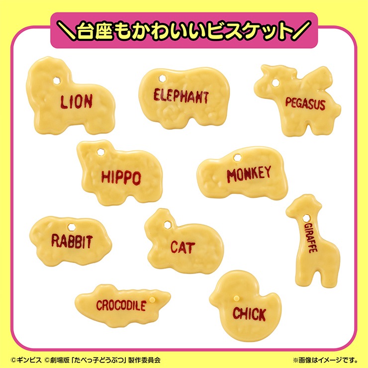 たべっ子どうぶつたちのミニフィギュアと、ビスケットにそっくりな台座のおまけ入り。