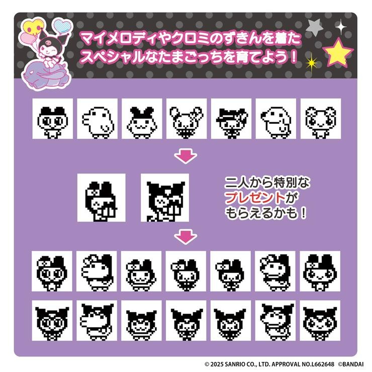 マイメロディ&クロミとコラボしたTamagotchi nanoです。 二人と一緒にたまごっちのお世話を楽しむことができ、育て方によってマイメロディかクロミがたまごっちに頭巾をプレゼントしてくれます。