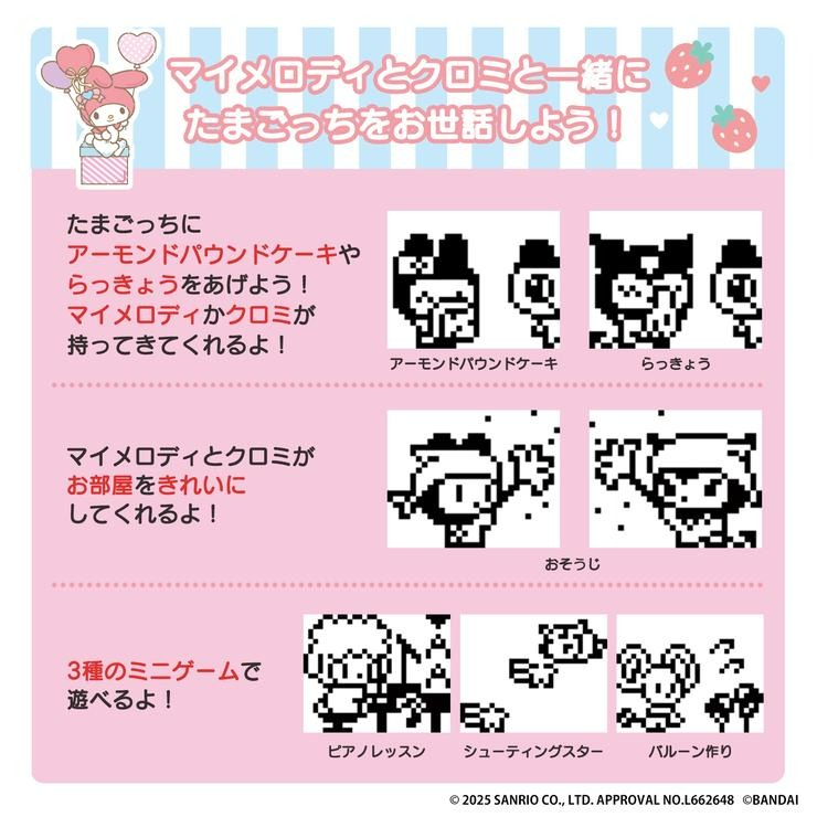 マイメロディ&クロミとコラボしたTamagotchi nanoです。 二人と一緒にたまごっちのお世話を楽しむことができ、育て方によってマイメロディかクロミがたまごっちに頭巾をプレゼントしてくれます。