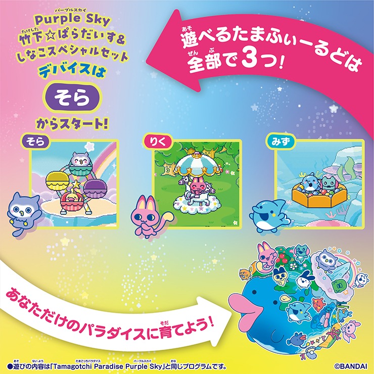 Tamagotchi Paradise - Purple Skyに特別研究員の竹下☆ぱらだいす&しなことのコラボレーションバージョンが登場!