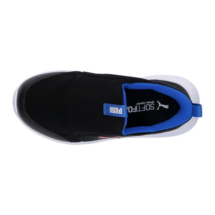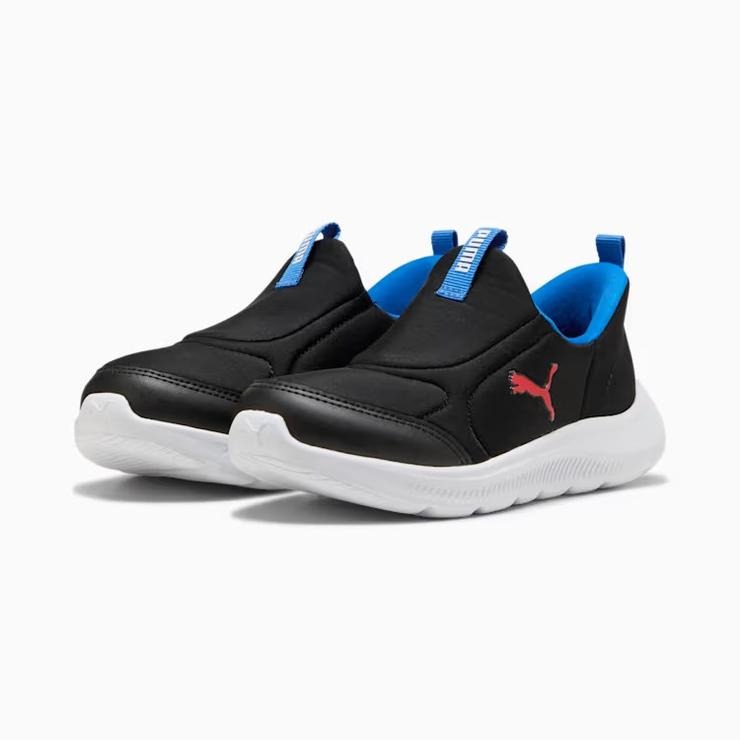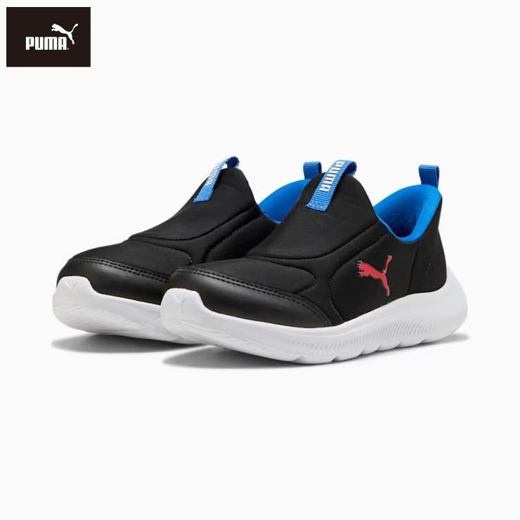 伸び縮みする快適なアッパー、お子様に便利なスリッポン構造、大きなプーマキャットが目を引くプーマ ファン レーサー 2。