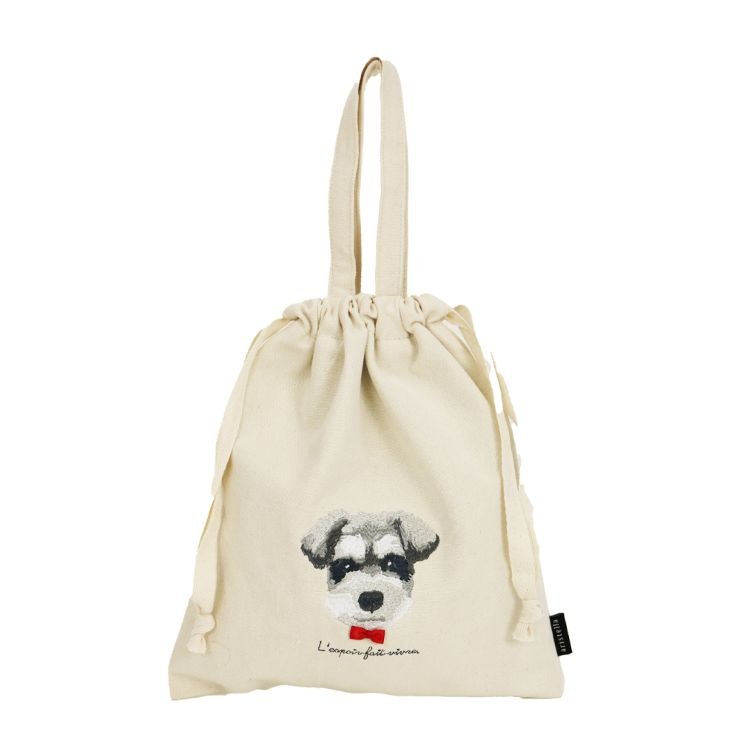 可愛い刺繍のアニマルにワンポイントで立体パーツがついたアトリエ・ポピンシリーズの巾着。トートバッグのように使用したり、旅行時の収納バッグとしても◎