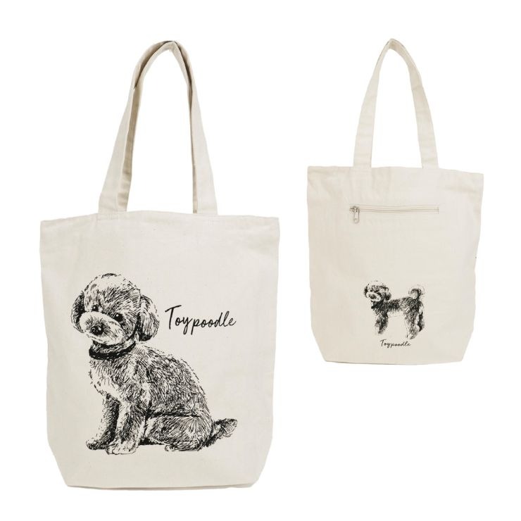 優しい手書きの動物がプリントされたトートです。 A4サイズの書類も入り、サブバッグとしても活躍します。 背面にもファスナーポケットが付いており、表面とは違う表情の動物プリントも!