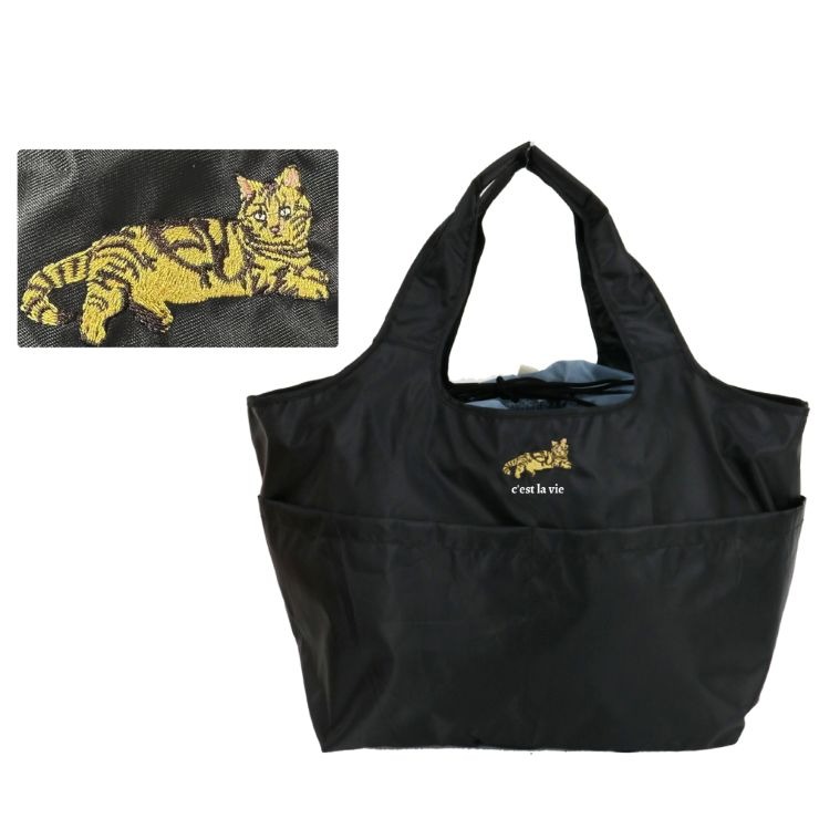 大きめの買い物レジカゴにも楽々入るエコバッグです。 背面のゴムでコンパクトにたためます。 内側は簡易保冷生地でワンポイントにアニマル刺繍が入っています。