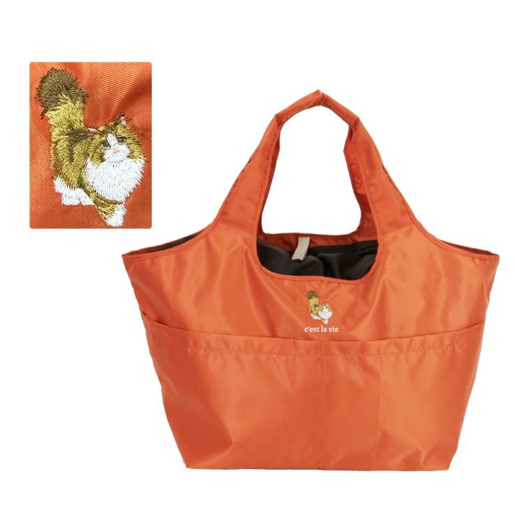 大きめの買い物レジカゴにも楽々入るエコバッグです。 背面のゴムでコンパクトにたためます。 内側は簡易保冷生地でワンポイントにアニマル刺繍が入っています。